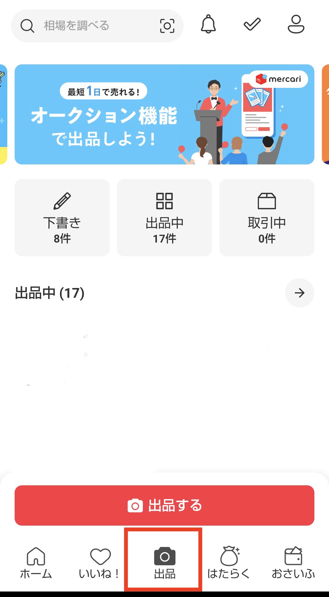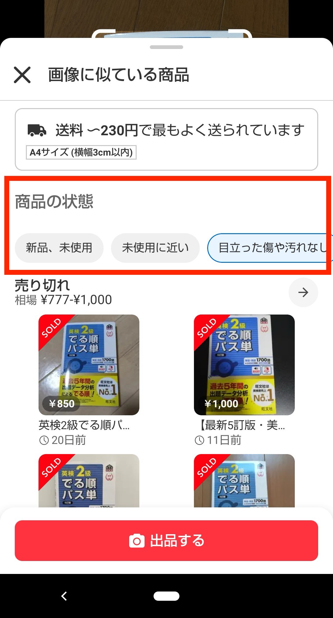 メルカリを起動し下にある「出品」をタップし上部の「相場を調べる」右横のマークをタップし出品する商品を撮影します。