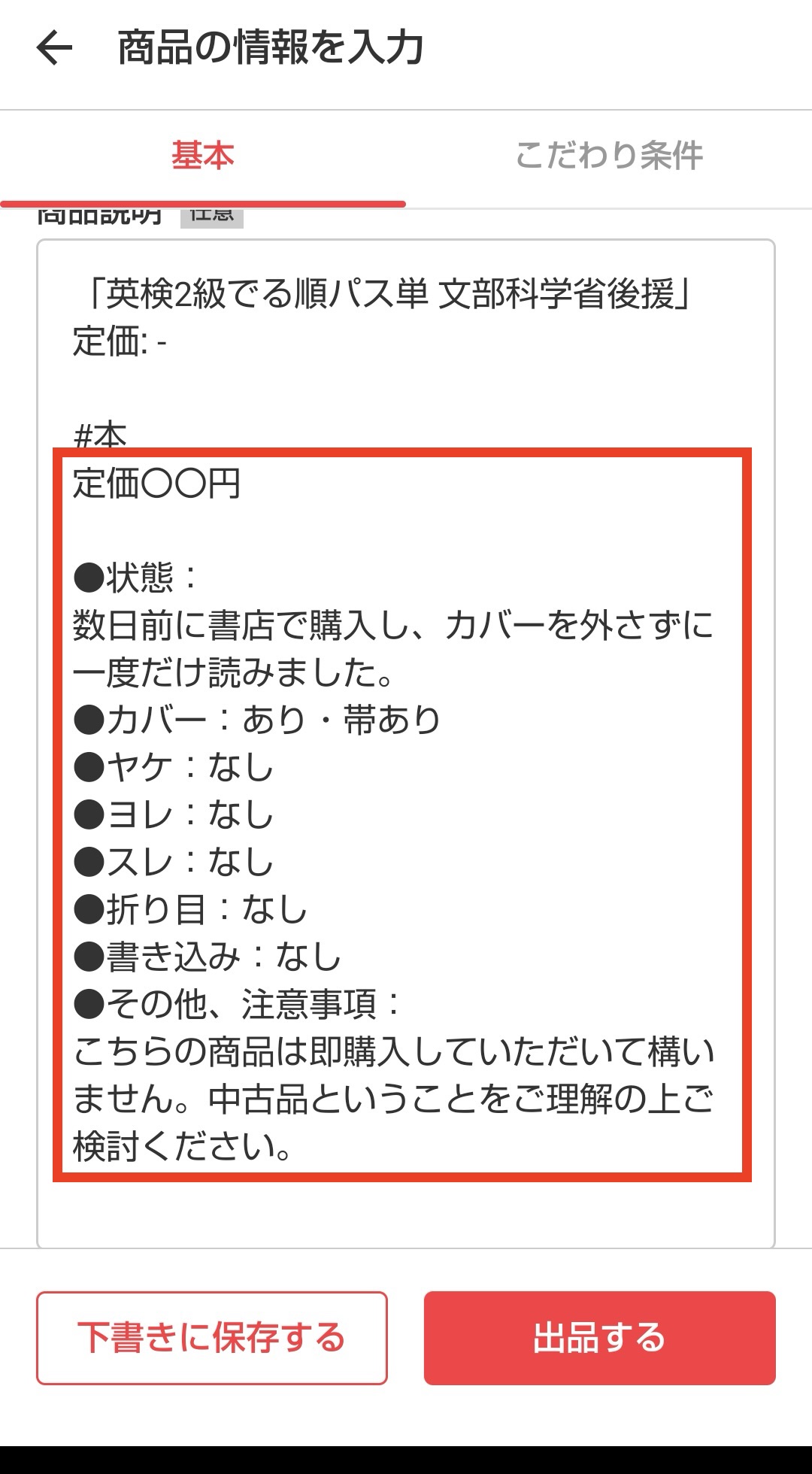 特に学生さんの参考書や主婦の方のレシピ本などは、『書き込みなし』『帯あり』と書いておくと、より売れやすくなりますよ。